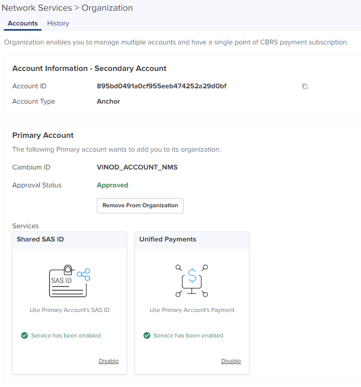 An Organization allows multiple accounts to share CBRS billing and SAS ID. The Primary Account owns this configuration, and the Secondary Account can optionally share it. Both accounts must authorize the sharing.