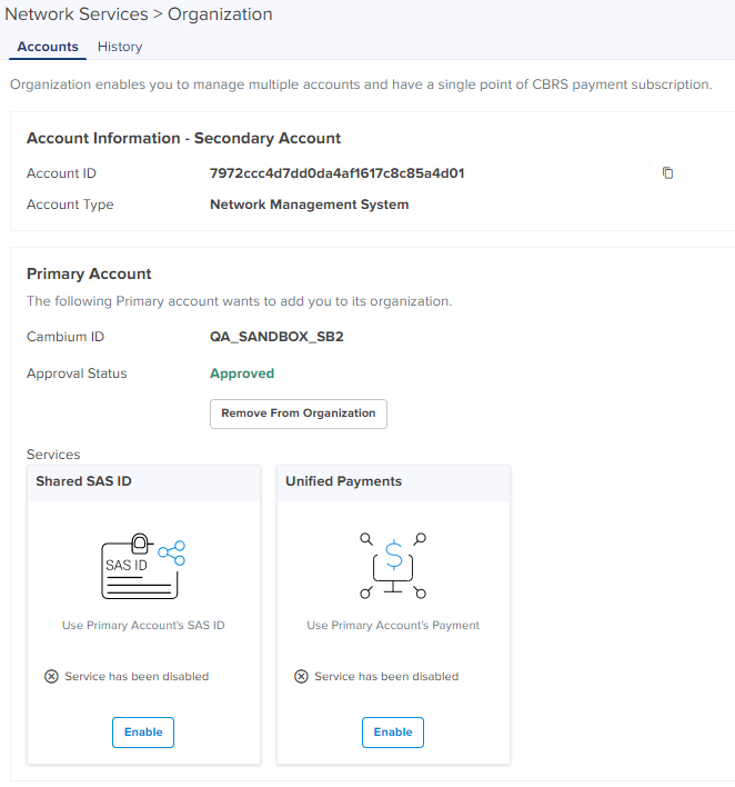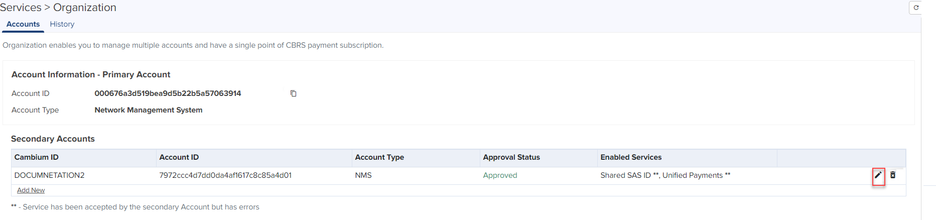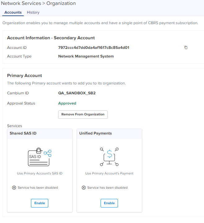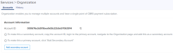 When the services are active in CBRS of the Secondary Account, the Primary Account cannot disable those services. |