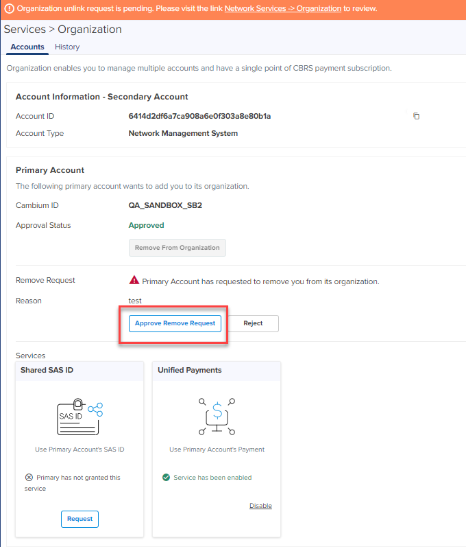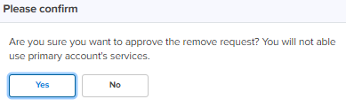 The Secondary Account administrator must approve the remove request from the Primary Account. For more details, refer to Approve Remove Request (with active services).