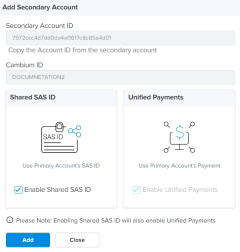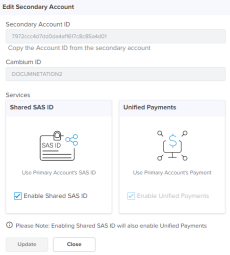 | | Unified Payments: This allows the Secondary Account to use payment details configured in the Primary Account. |