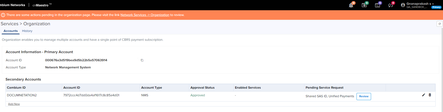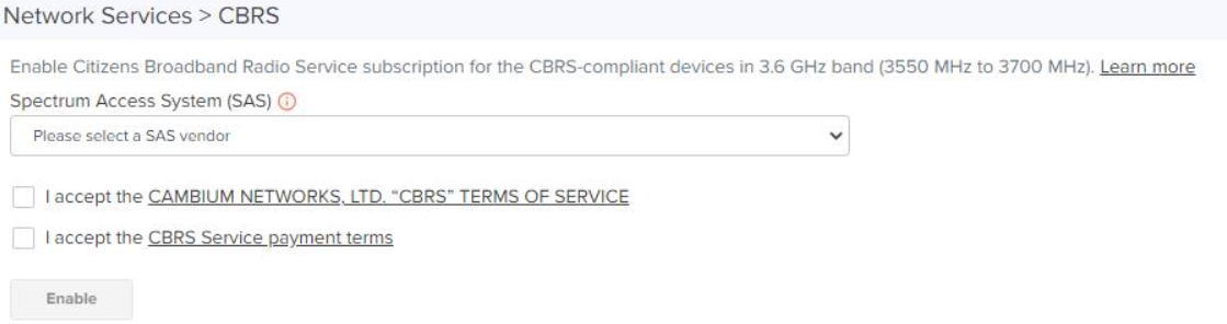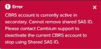 Services in the Secondary Account cannot be disabled unless CBRS is inactive in Secondary Account. Contact Cambium Support to disable CBRS operation or change SAS Vendor. |