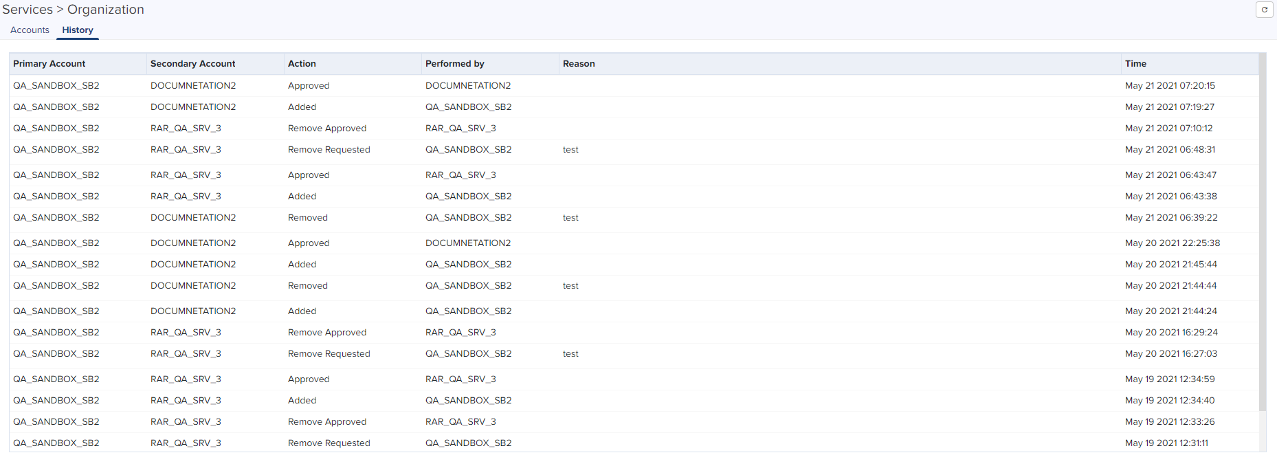 In Organization History user can view changes to the Organization status over time. This includes details of Primary Account, Secondary Account, Action, Performed by, and Reason.