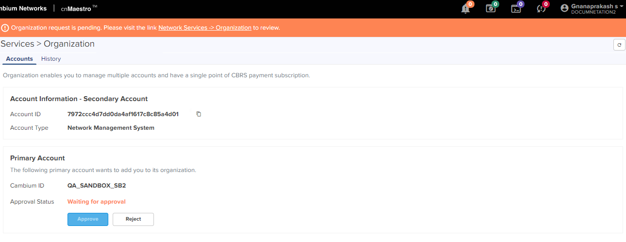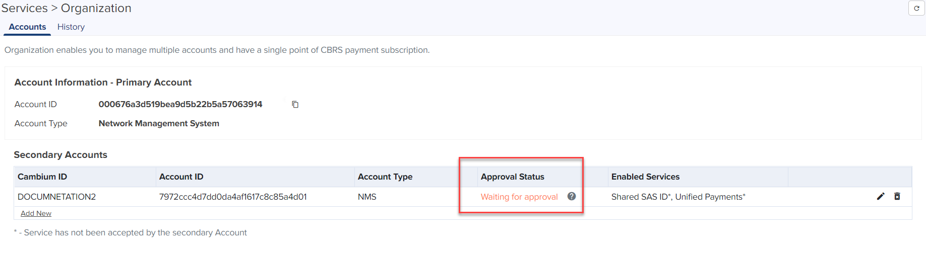 The Primary Account administrator must approve this request from the Secondary Account in order to enable the services.
