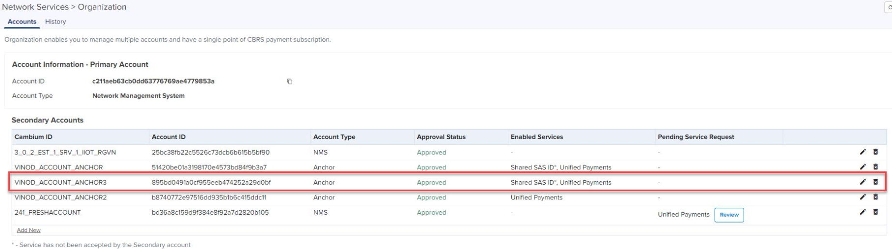 | | Shared SAS ID: This allows the Secondary Account to use the CBRS SAS ID configured in the Primary Account. |