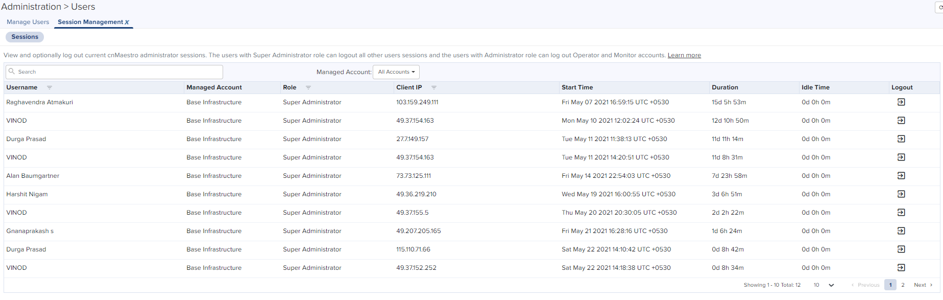 View and optionally log out current cnMaestro administrator sessions. The users with Super Administrator Role can logout all other users sessions and the users with Administrator Roles can log out Operator and Monitor accounts.