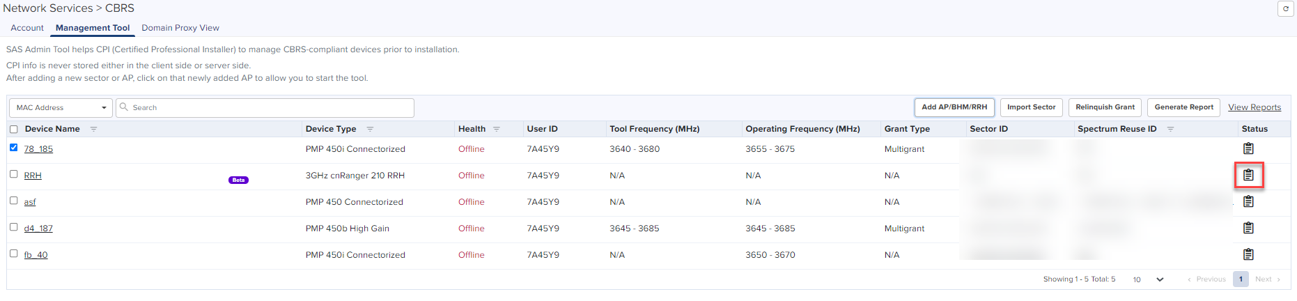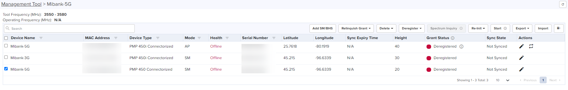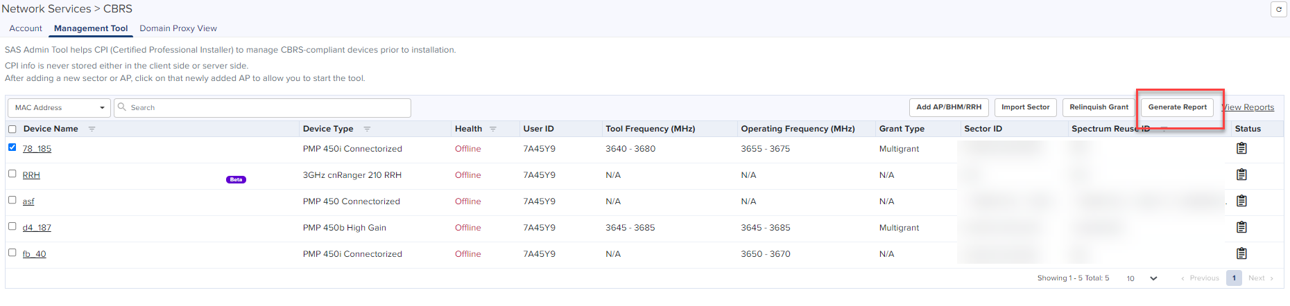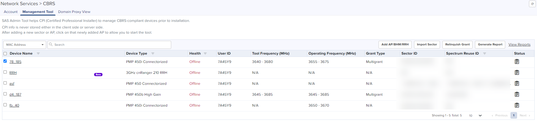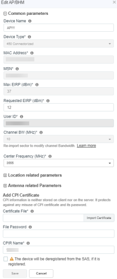 The Management Tool allows one to register CBRS devices to the SAS provider before physically connecting CBRS-complaint devices to the network. The following Cambium CBRS-compliant devices operate in 3.6 GHz band frequency, ranging from 3550 to 3700 MHz: