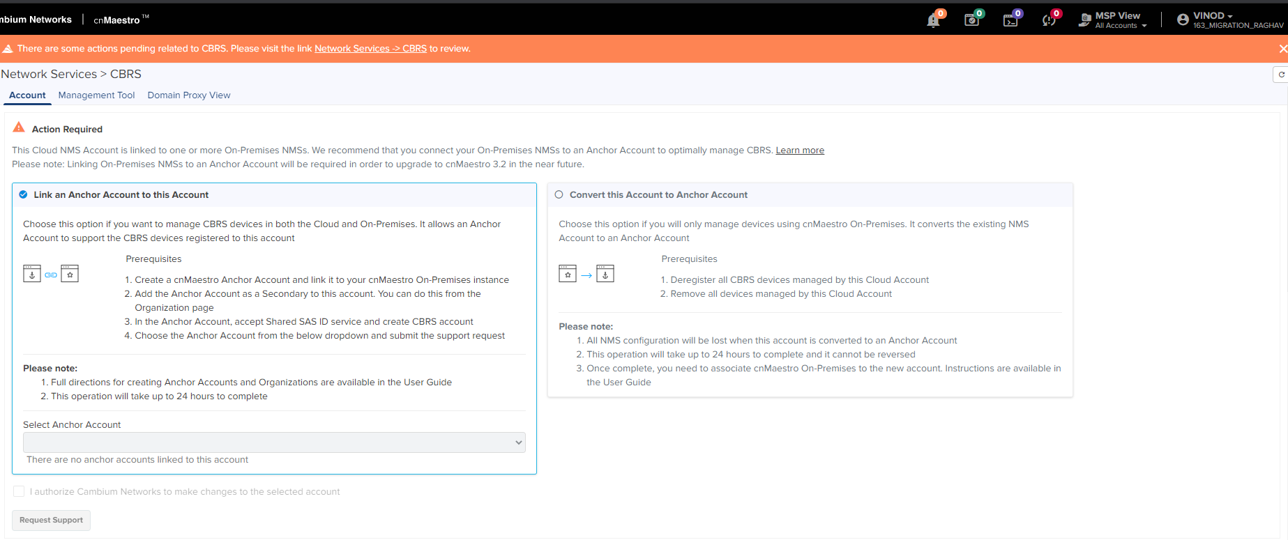 Select this to manage CBRS devices in On-Premises only. It converts an existing NMS account to an Anchor account.