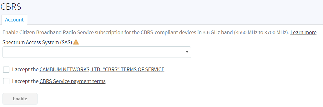 Click I accept the CAMBIUM NETWORKS, LTD. "CBRS" Terms of Services and I accept the CBRS Service payment terms to activate Enable button. |