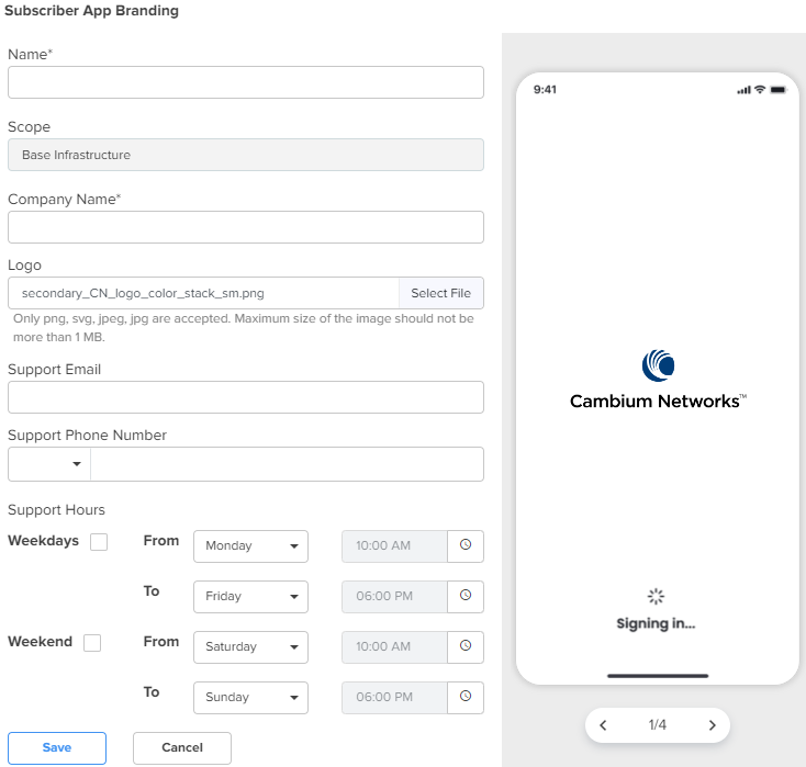 Customize the cnMaestro Subscriber application with your company name, brand logo, and other details, such as support contact information and timings. This branding can be associated with individual subscriber service profiles.