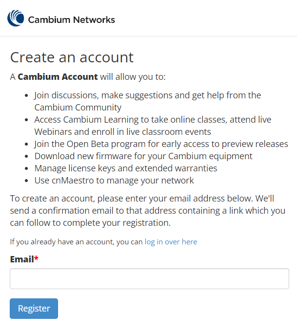 cnMaestro uses an existing Cambium Support Center account. If you do not have an account, you must create one.
