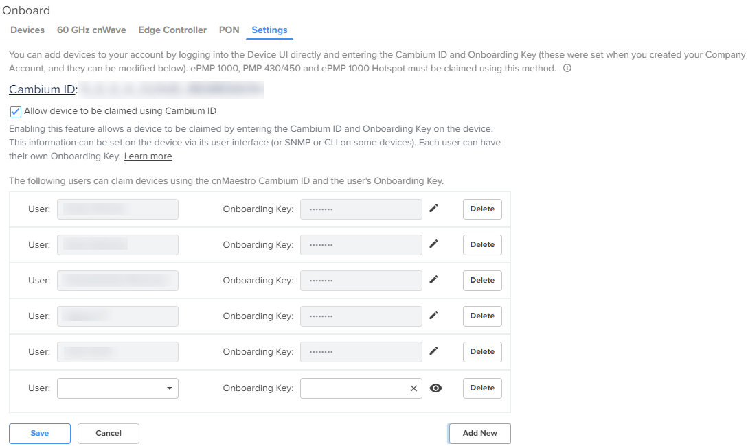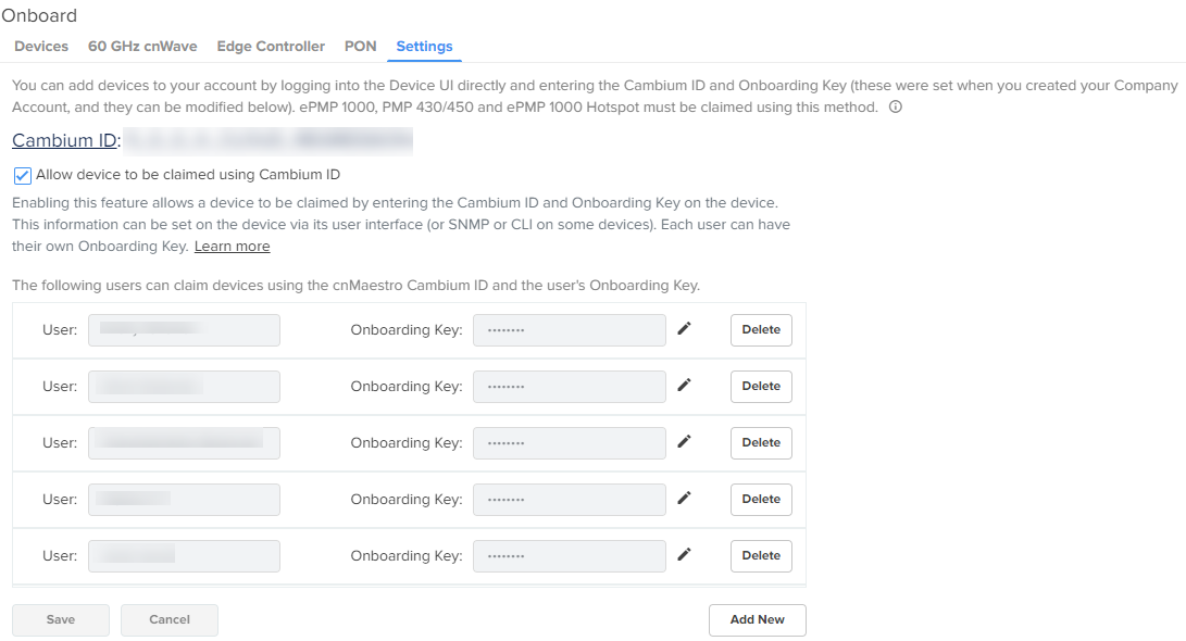 Each Onboarding Key is mapped to an individual User account. This mapping allows Cambium Cloud to know who is onboarding a device, and the key can be revoked if needed.