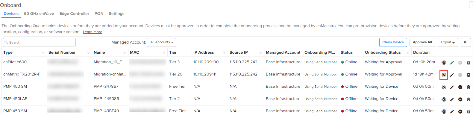 To onboard the device when it contacts cnMaestro, click the Approve Device (