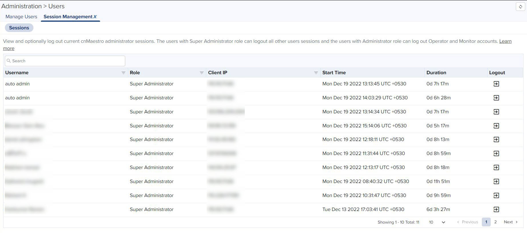 View and optionally log out current cnMaestro administrator sessions. The users with Super Administrator role can logout all other users sessions and the users with Administrator role can log out Operator and Monitor accounts.