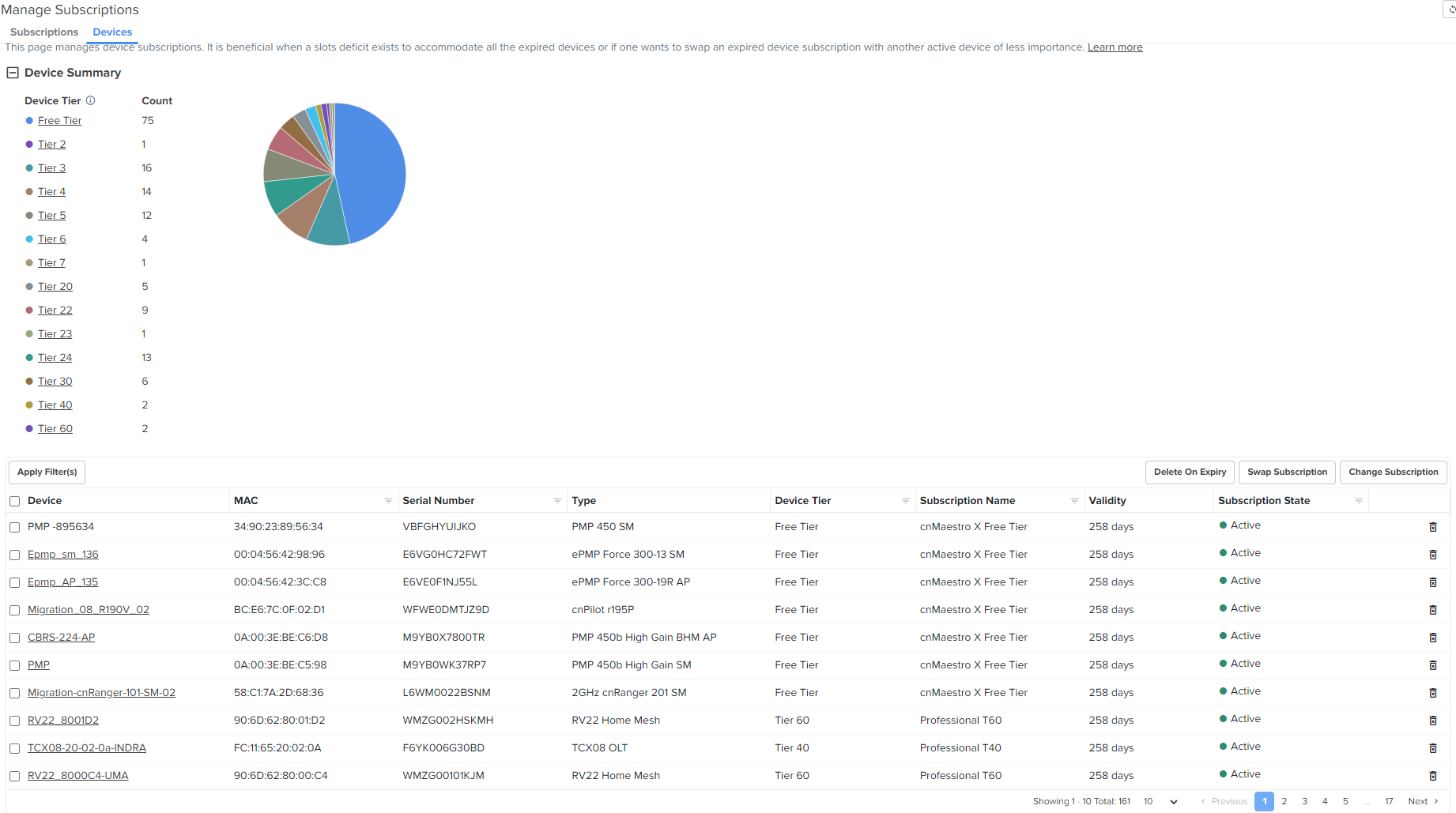 Devices page manages device subscriptions. It is beneficial when a slots deficit exists to accommodate all the expired devices or if one wants to swap an expired device subscription with another active device of less importance. For more info refer to Subscription Management.