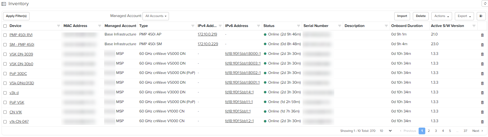 The Inventory page displays a list of devices under the selected Node. It presents health and maintenance information provides a tabular view that allows for sorting and filtering. When selected for a single device, it presents a detailed customized page of that device.