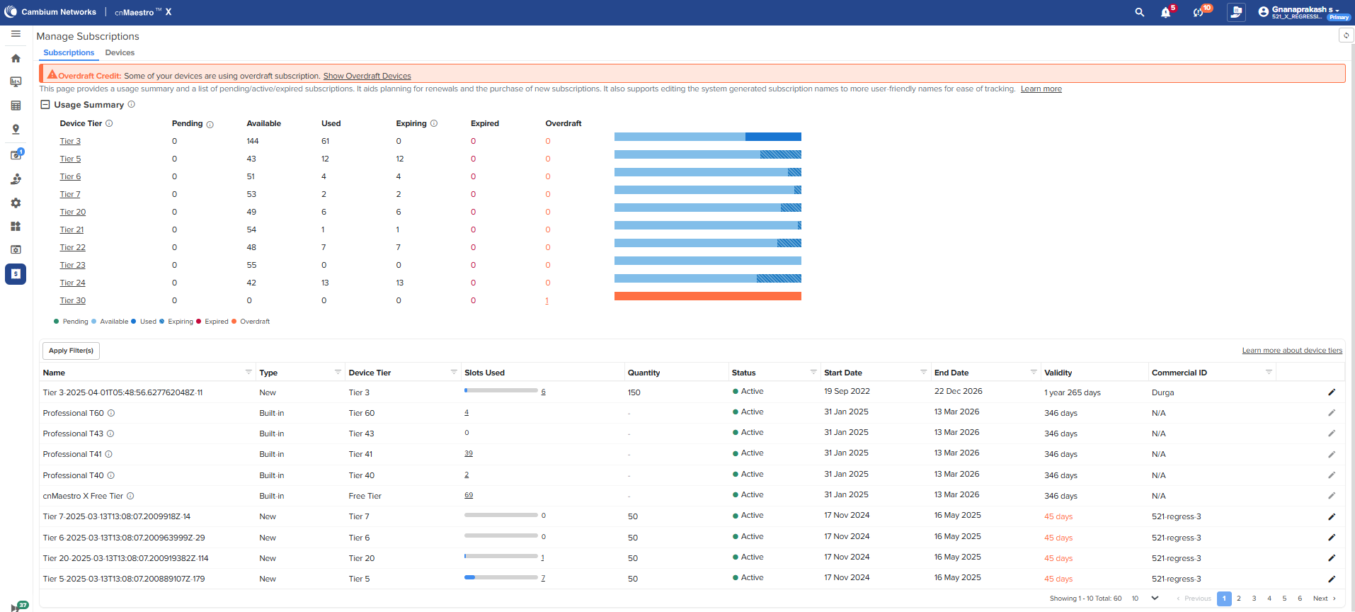 Subscriptions page describes about the usage summary and a list of pending, active, and expired subscriptions. It aids planning for renewals and the purchase of new subscriptions.