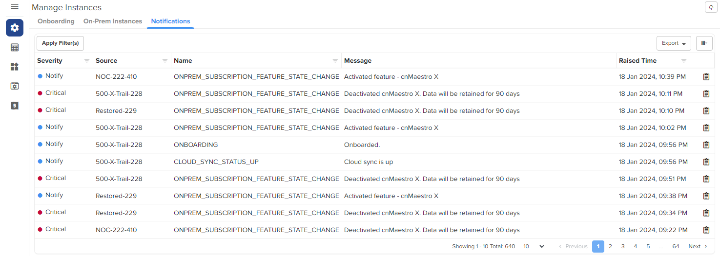 Notification page displays the history of the most recent events notification of On-Premises instances with Severity, Source, Name, Raised Time, and Message.