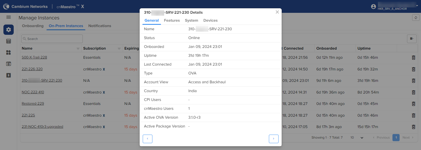 By clicking the instance host name, you can see the On-Premises server details such as General, Features, System, and CBRS: