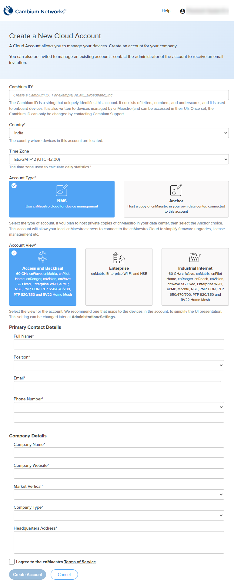 If you do not have a Cloud NMS Account, you will be asked to create one after logging in and accessing cnMaestro Cloud. The NMS Account allows you to access cnMaestro functionality and start claiming devices.
